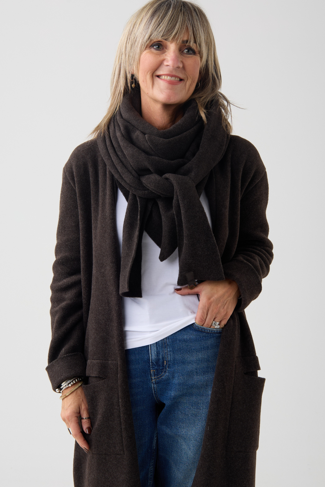 This triangle scarf has been an absolute bestseller for years. The special quality of fleece feels soft on the neck and can be used as a warm scarf, as a comfortable shawl, and as a pillow or blanket when traveling.