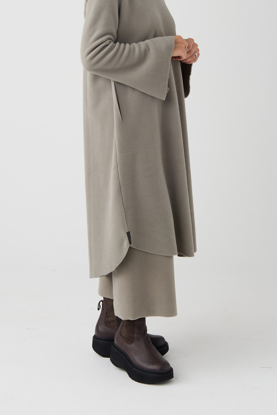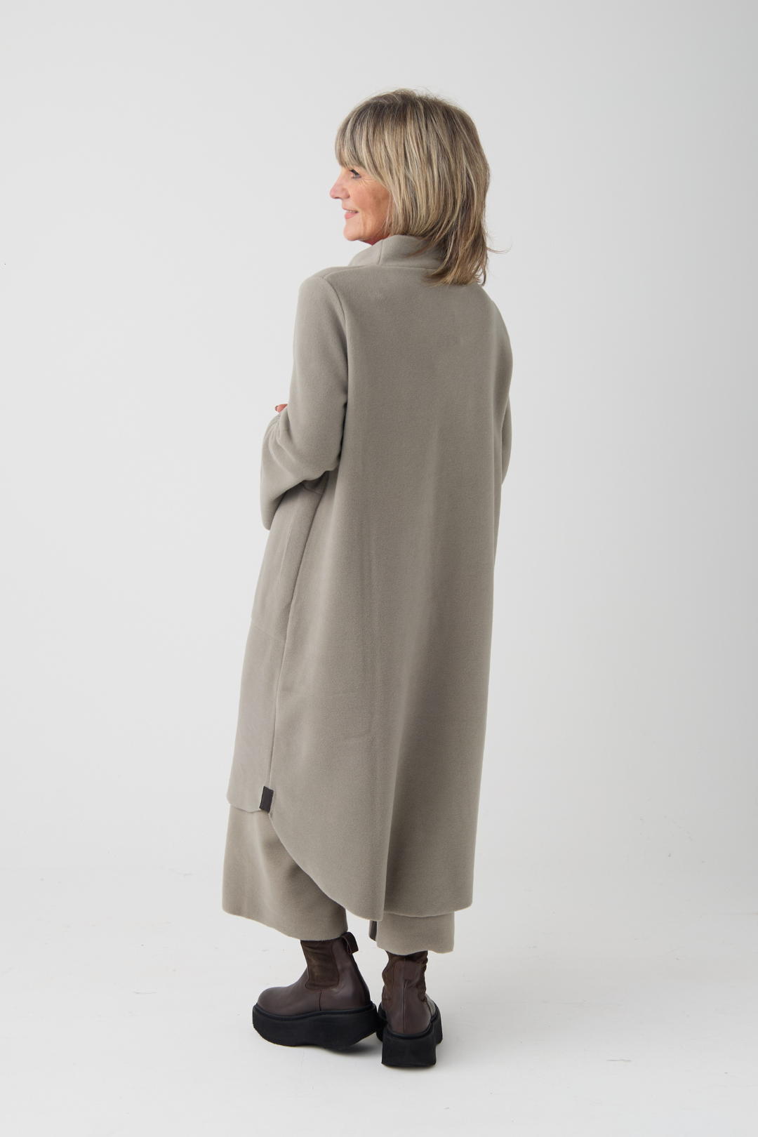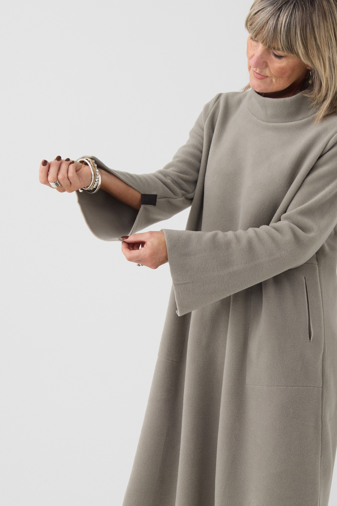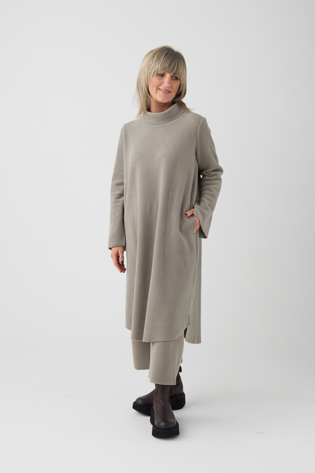 The perfect winter dress, designed with long sleeves, a high neck, and a straight fit that drapes beautifully. As a refined touch, the hem is rounded, subtle split sleeves are added, and a slightly longer back creates a modern and comfortable look.