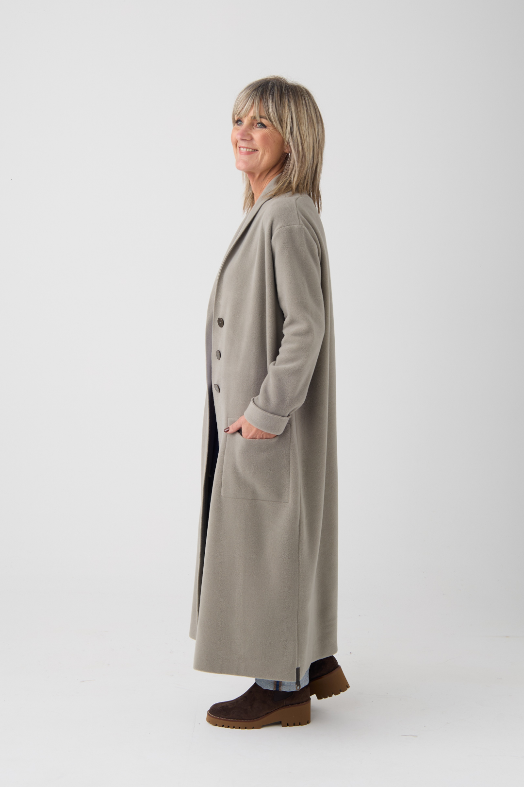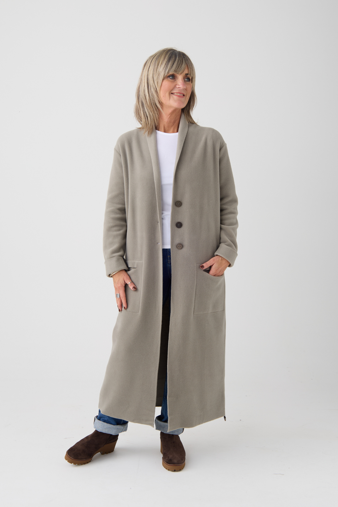 Long cardigan with large collar, pockets, and three brass buttons down the front.