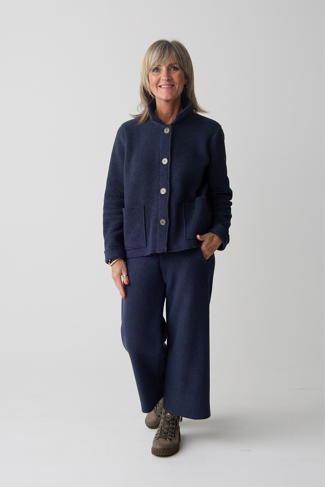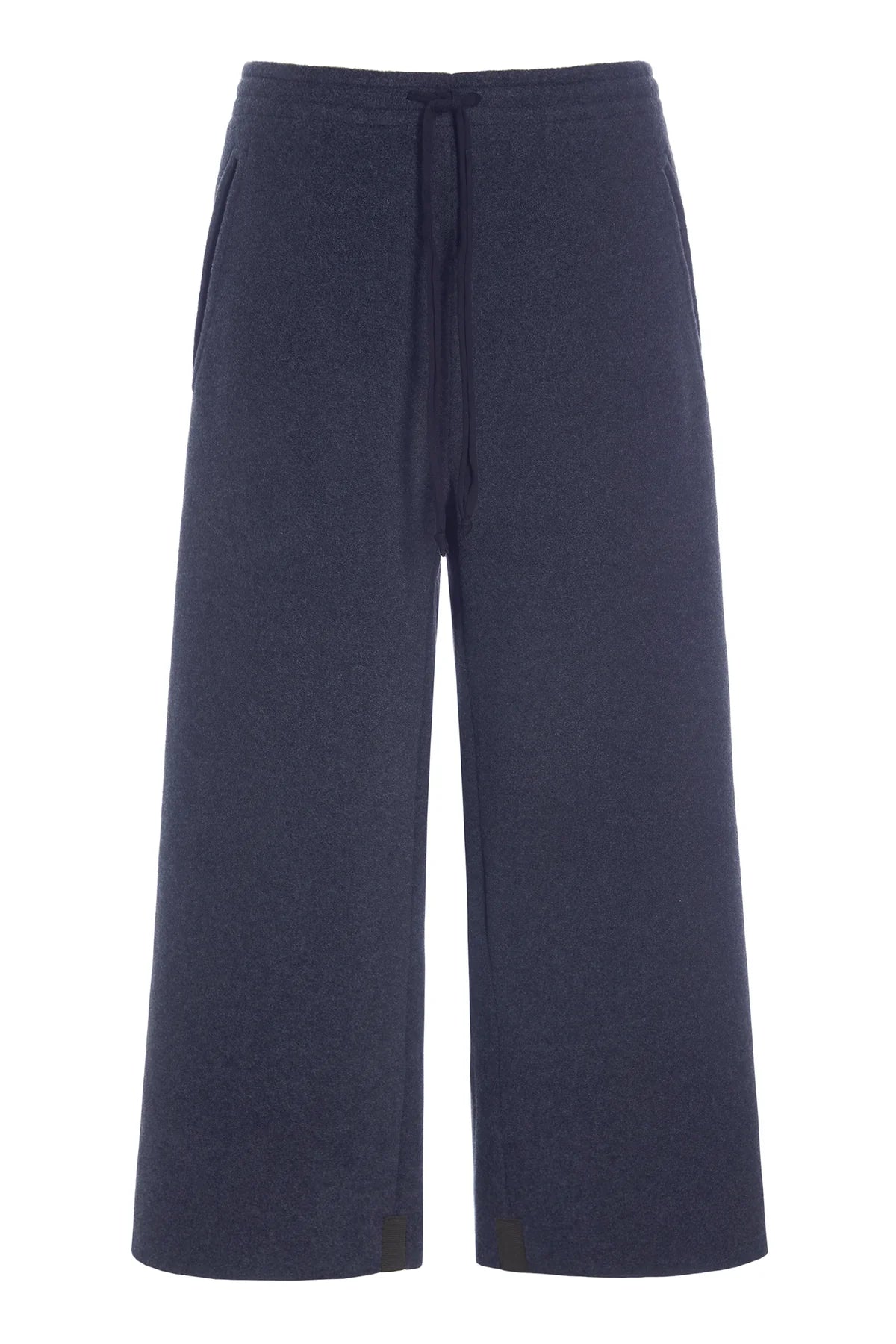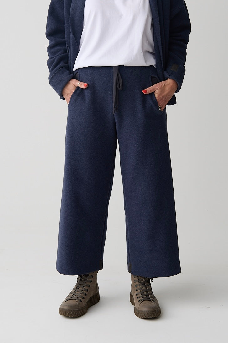 Fleece pants with flare legs in mid-calf length. The pants have pockets in the sides and ties in the front.