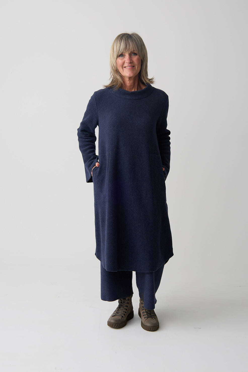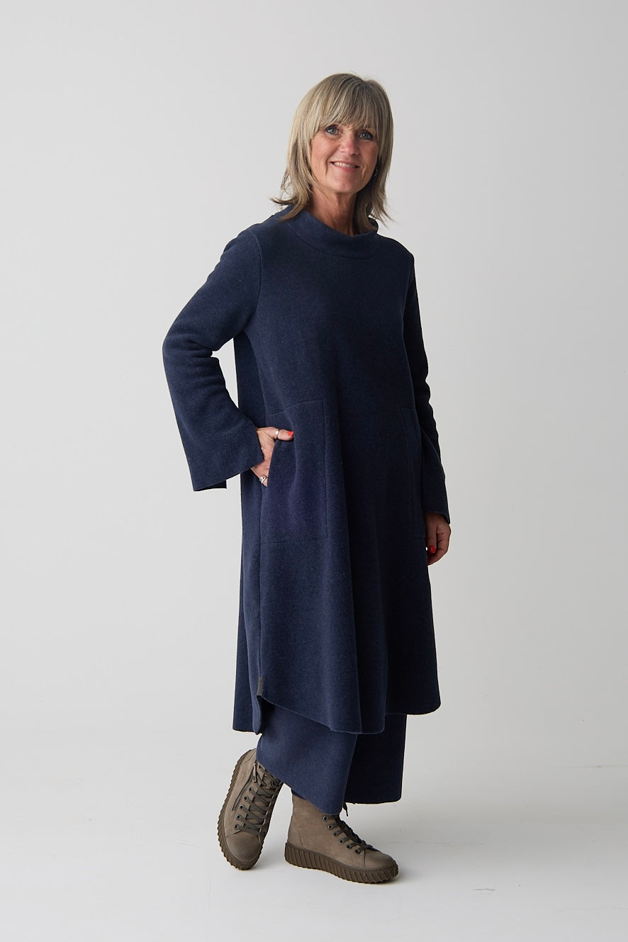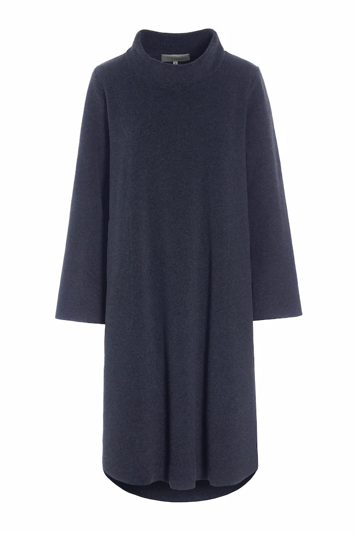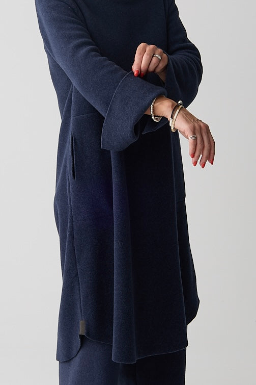 A feminine dress designed with a double layer turtleneck with a flattering bottom curved hem with extra length at the back for a graceful silhouette. Small slits at the sleeves add an elegant touch.