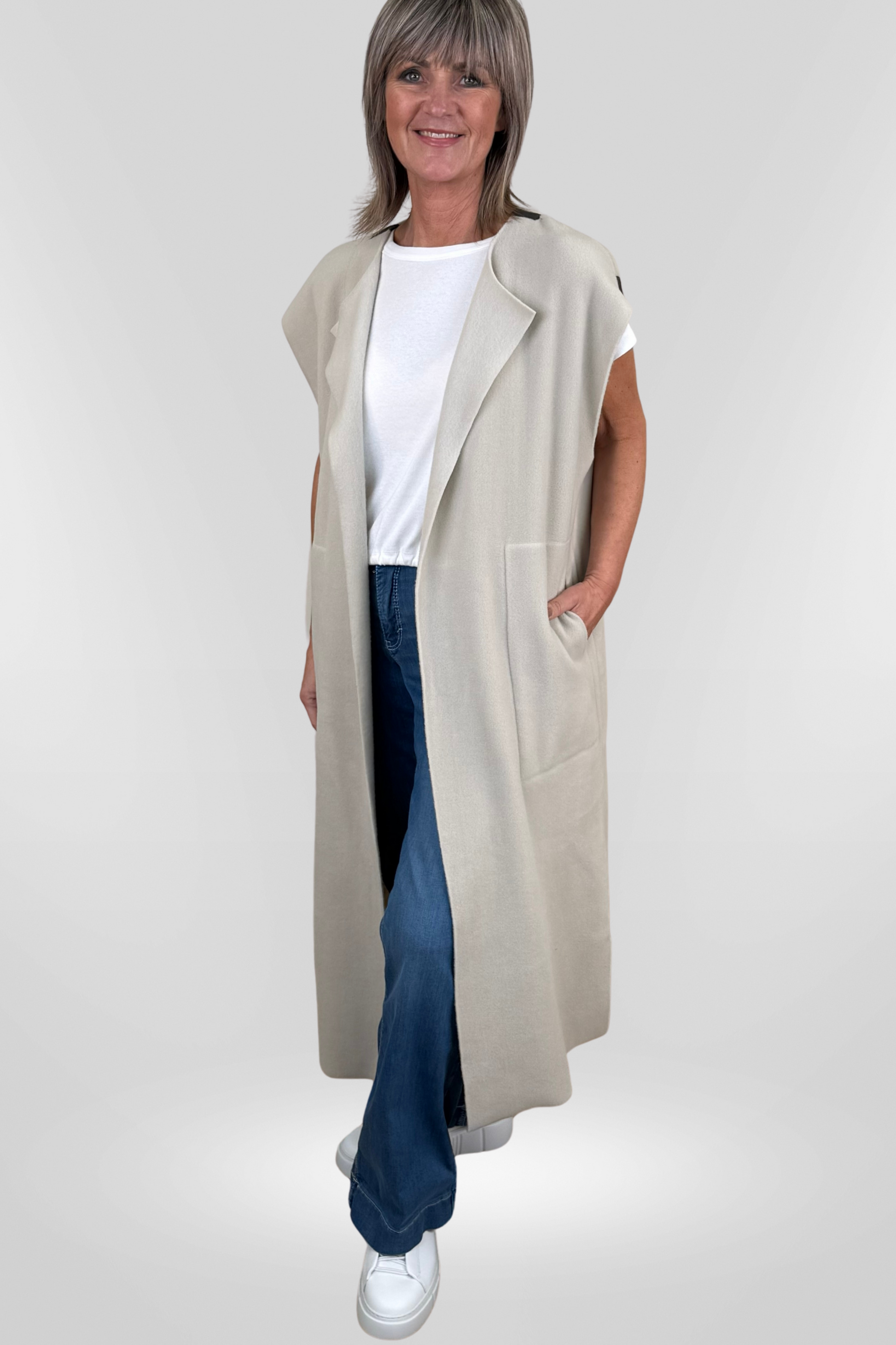 Long vest in a loose fit with large pockets, side slits and large arm openings which makes it possible to style with a sweater.
