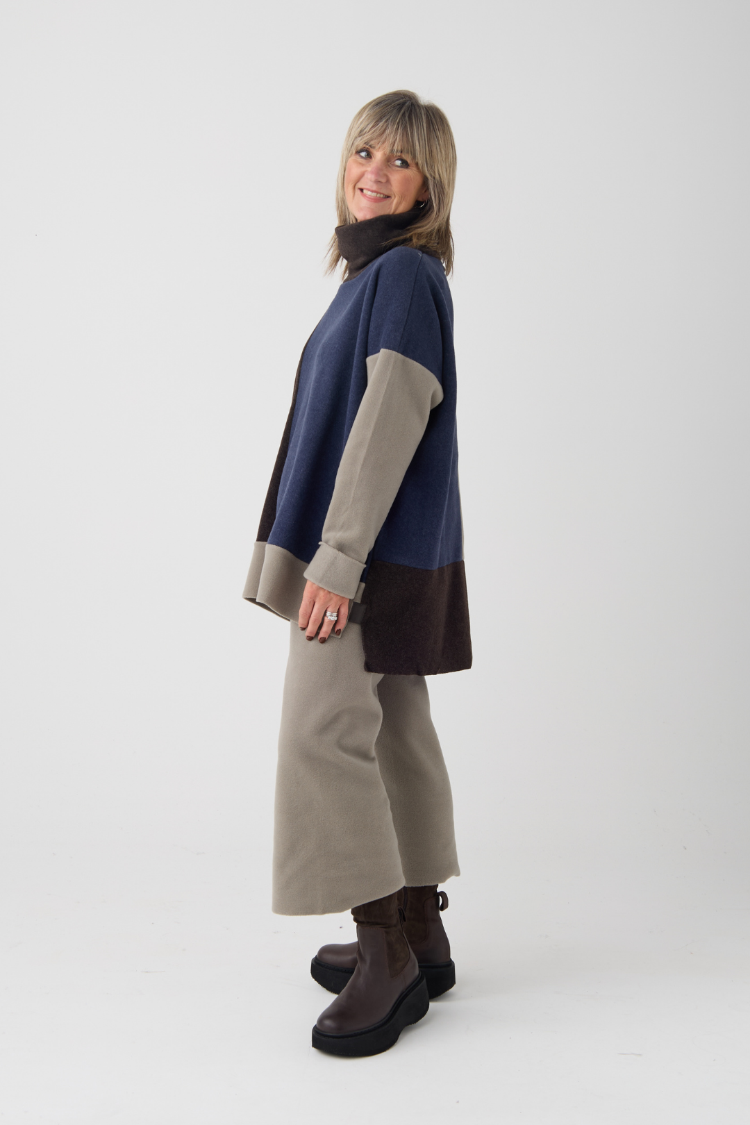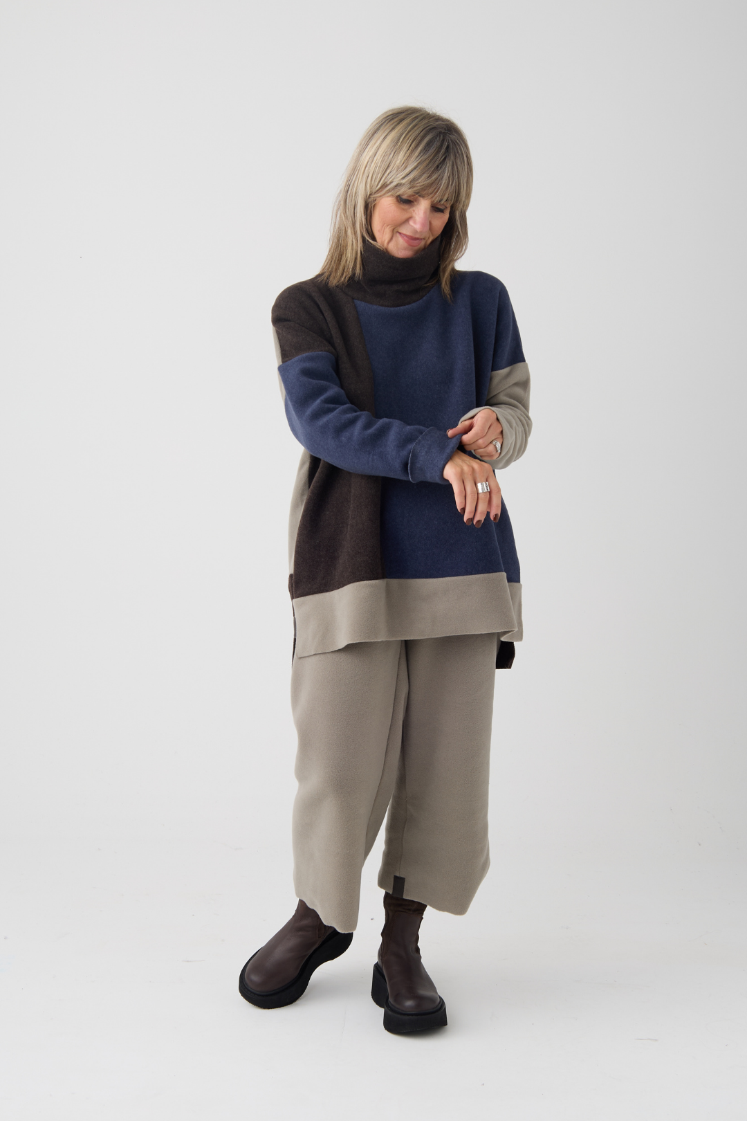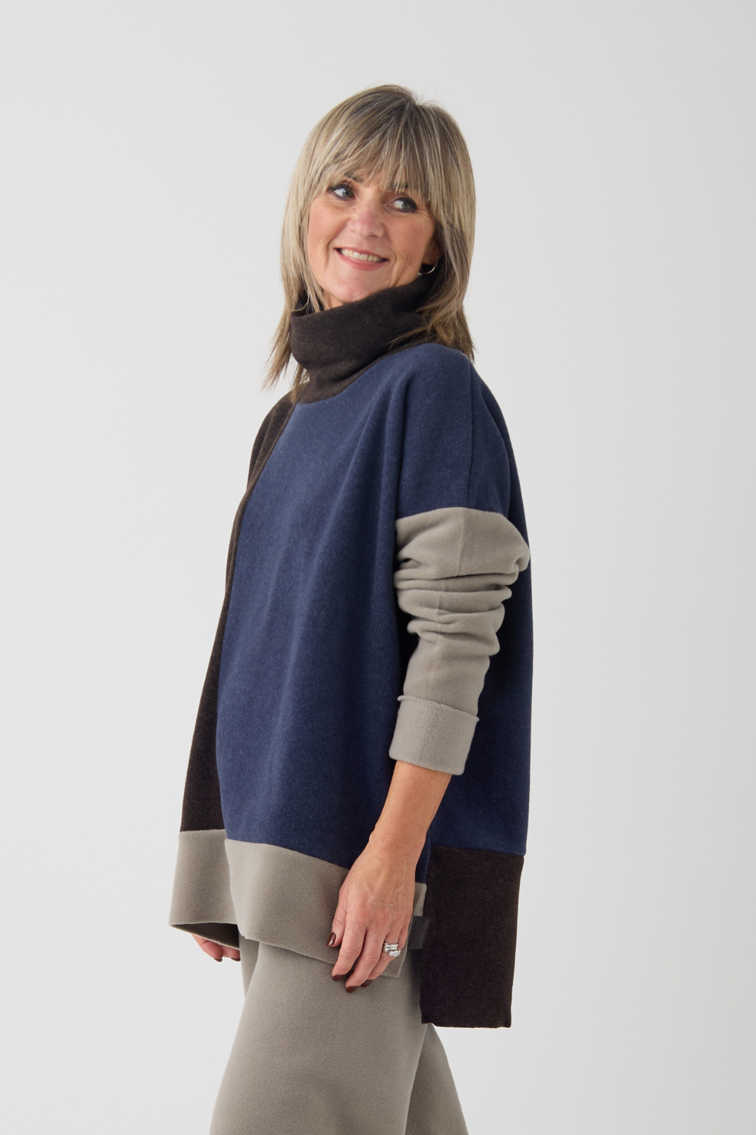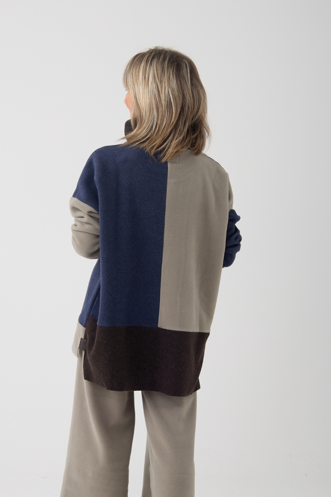 Multicolored box-shaped sweater with high neck. The sweater is longer in the back and has slits up the sides. As part of our PATCH line, this sweater comes in different combinations of our classic, soft colors.