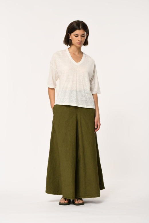 Loose-fitting t-shirt in flamed linen, V-neck, elbow-length sleeves, dropped armholes.