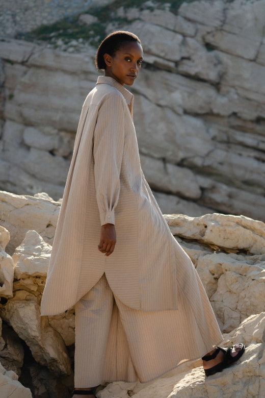 Shirt dress with fine stripes, midi length, long sleeves with buttoned cuffs, dropped armholes, side panels with horizontal stripes, side slits, pockets in the side seams.
