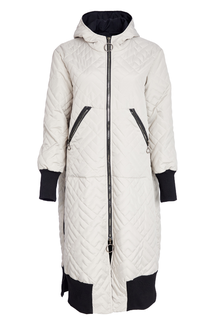 AM-PM READY; The knee length soft quilted coat from NAYA is the perfect AM to PM piece. Complete with a hood, zip close and contrast knit panels to the cuffs and hem its lightweight enough to layer under, not chunky or stiff, in fact its the most versatile car coat.