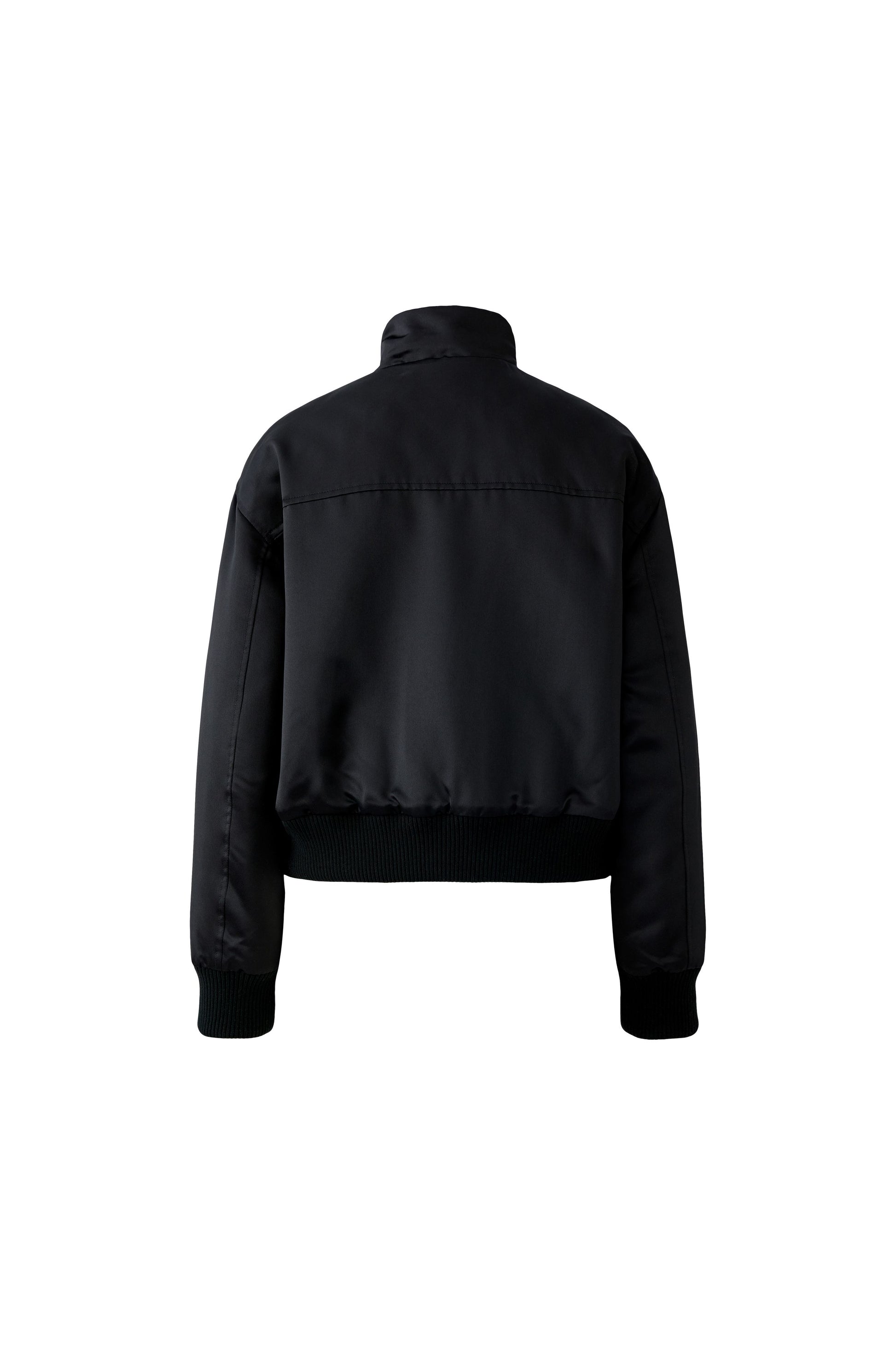 - Concealed metal zip closes to the end of the stand-up collar, overlap is fastened with a press stud