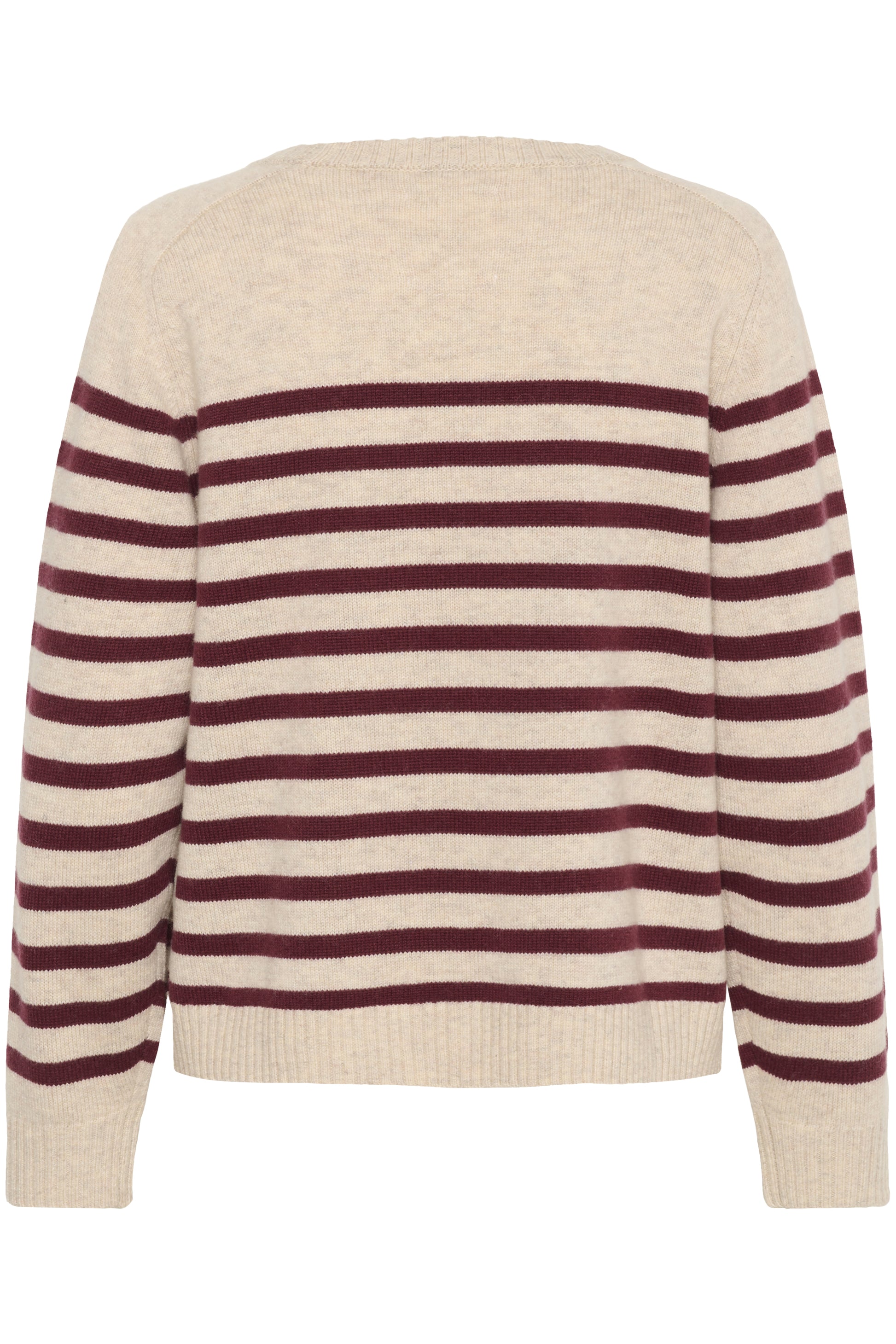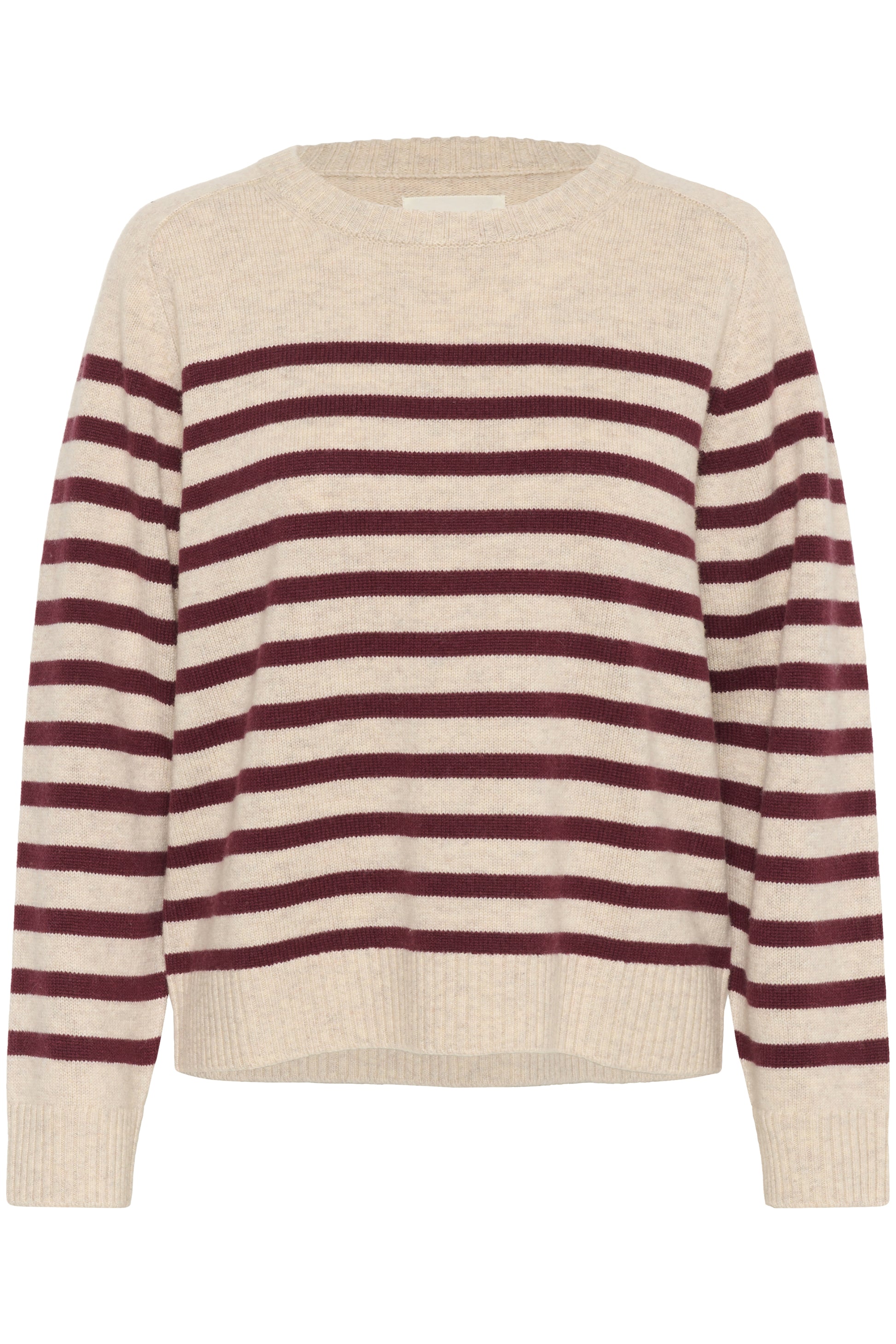 This soft knit with classic beige and burgundy stripes features a relaxed fit and a round neckline. Ribbed edges at the sleeves and hem add structure, while the timeless colour combination makes it easy to style. Wear it with jeans or wide-leg trousers for a casual yet stylish look.