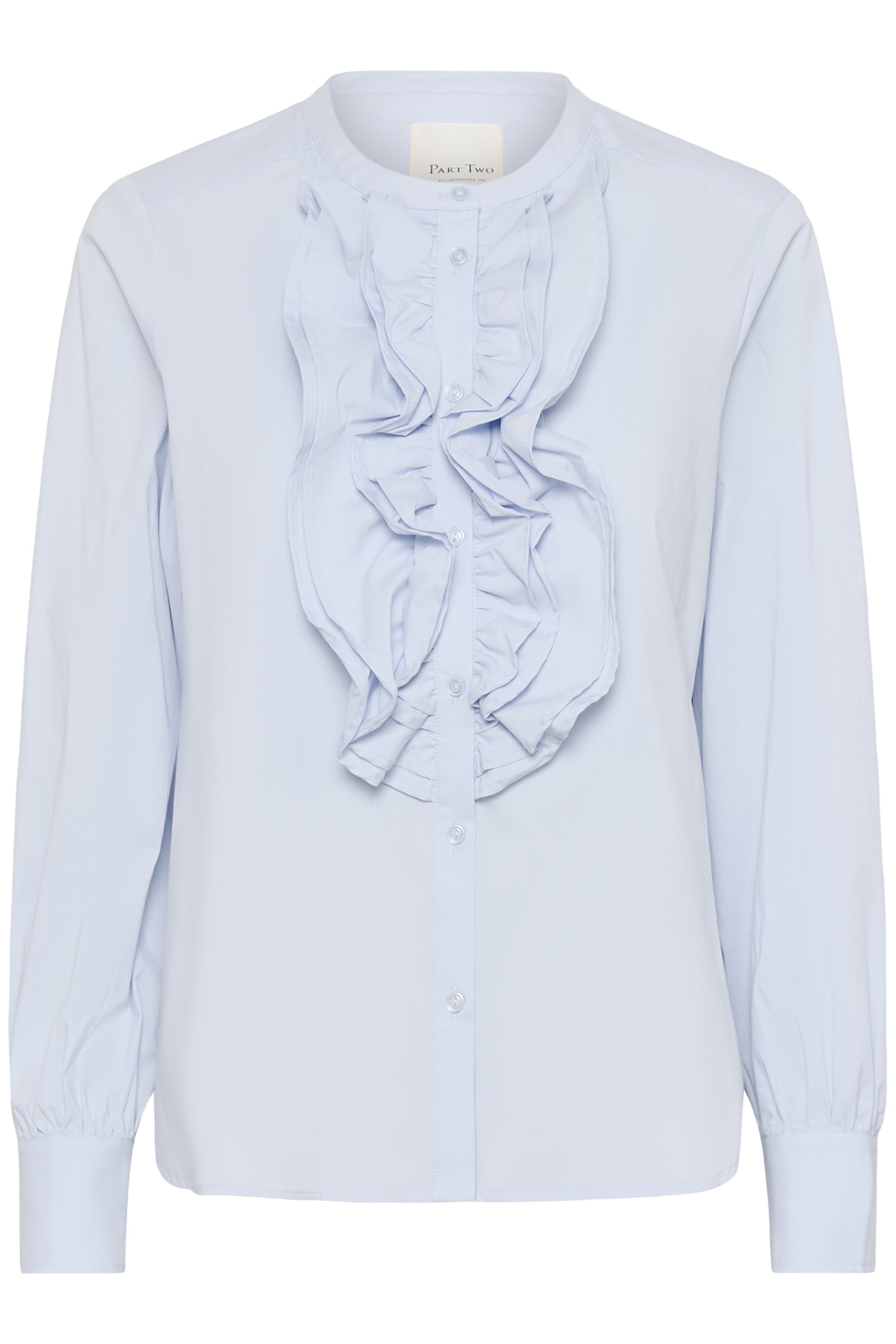 This light blue cotton-blend shirt features delicate ruffle detailing at the front and a round neckline, offering a classic and elegant expression. Wear it casually with denim or style it with a blazer for a more polished look.