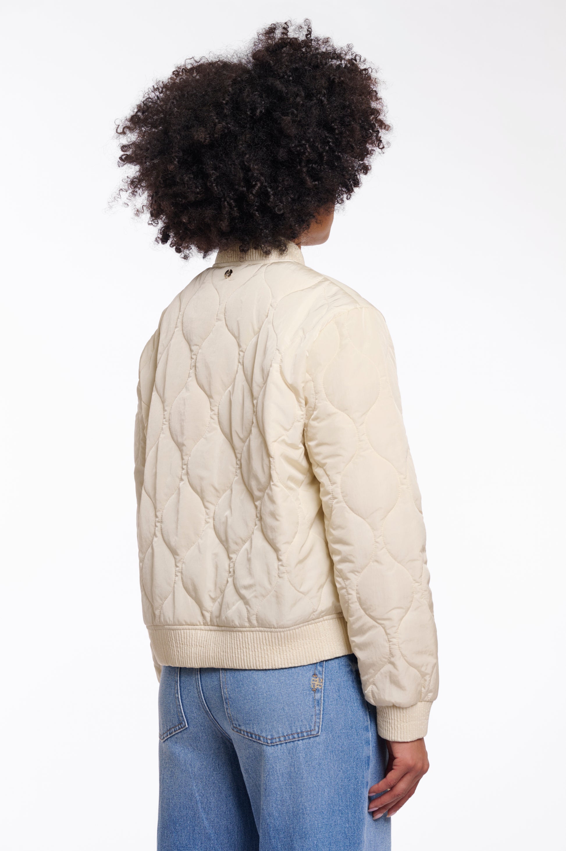 Stay effortlessly chic with this padded quilted bomber, crafted with recycled filling for lightweight warmth and a refined touch. Designed with a sleek zipper closure, ribbed cuffs, hem, and collar, it features a modern wavy stitched pattern that adds subtle dimension. Finished with side pockets secured by buttoned flaps, it blends casual comfort with elevated everyday style.