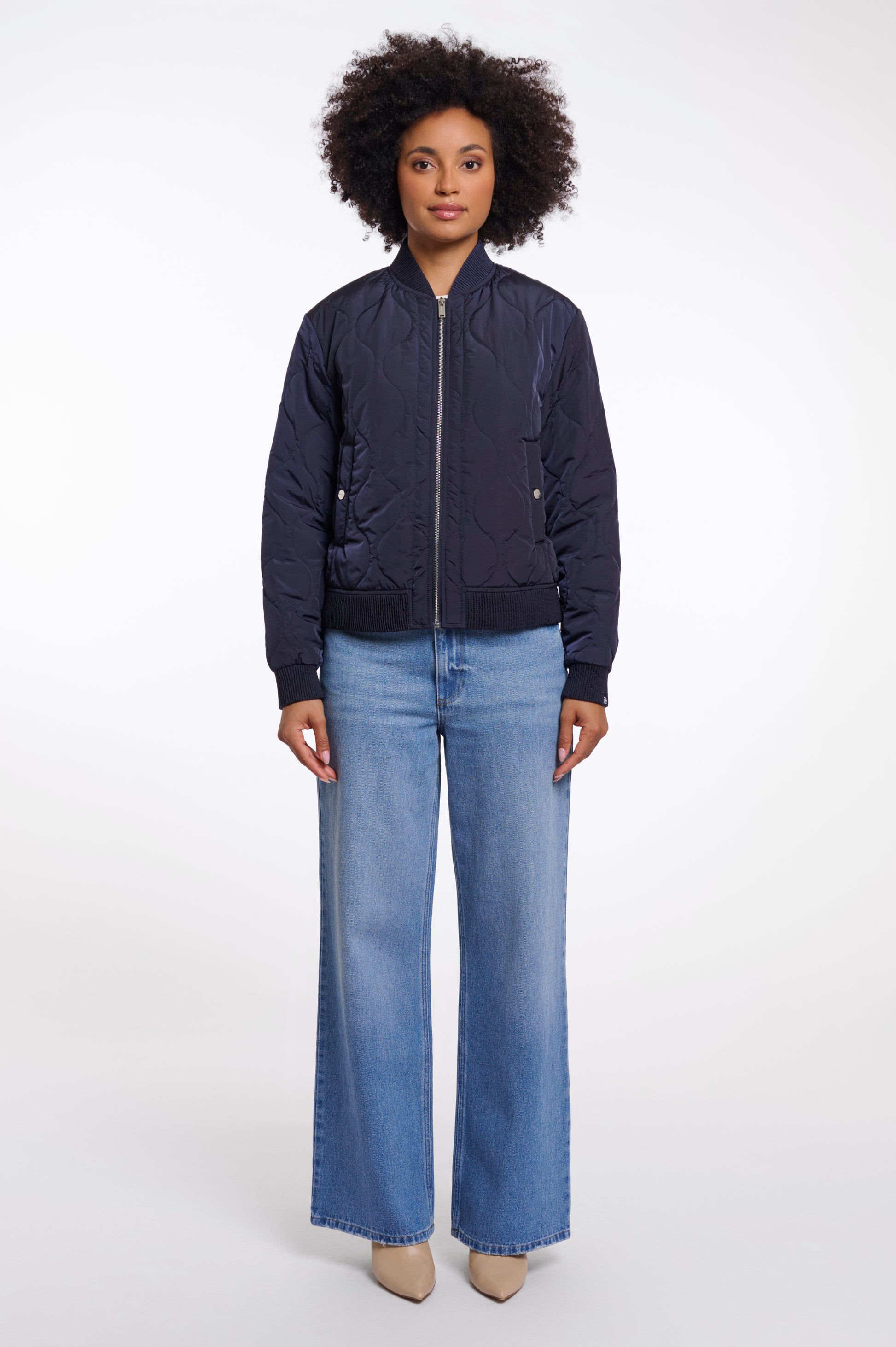 Stay effortlessly chic with this padded quilted bomber, crafted with recycled filling for lightweight warmth and a refined touch. Designed with a sleek zipper closure, ribbed cuffs, hem, and collar, it features a modern wavy stitched pattern that adds subtle dimension. Finished with side pockets secured by buttoned flaps, it blends casual comfort with elevated everyday style.