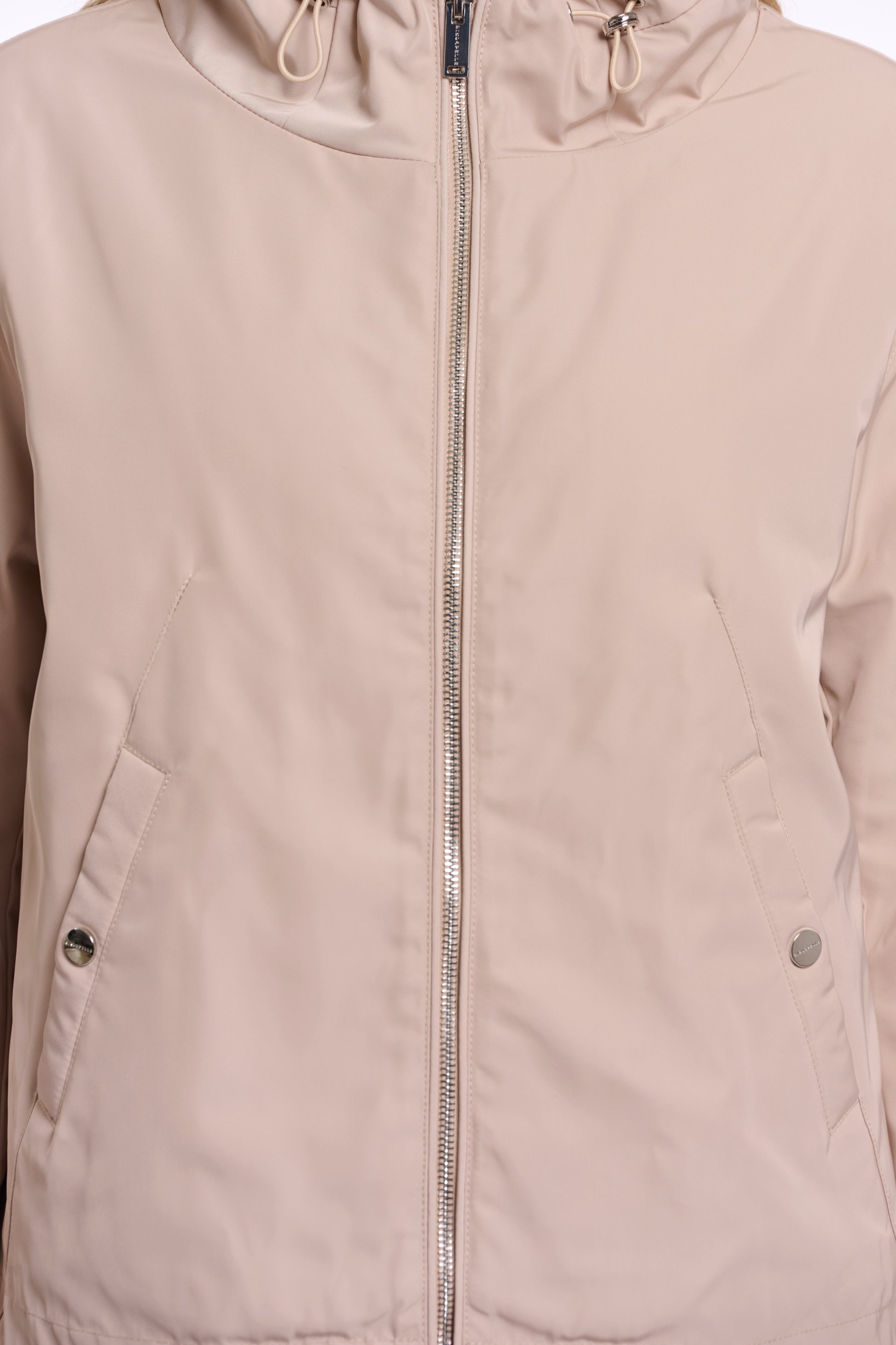 Wrap yourself in effortless elegance with this lightweight jacket, designed in a clean, streamlined silhouette reminiscent of a modern raincoat. Featuring a sleek zipper closure, a high standing collar with adjustable drawstrings, and discreet side pockets with snap-buttons, it blends practicality with refined detailing. Finished with neatly stitched cuffs and hem, it offers smooth comfort and subtle padding for a timeless, elevated outer layer.